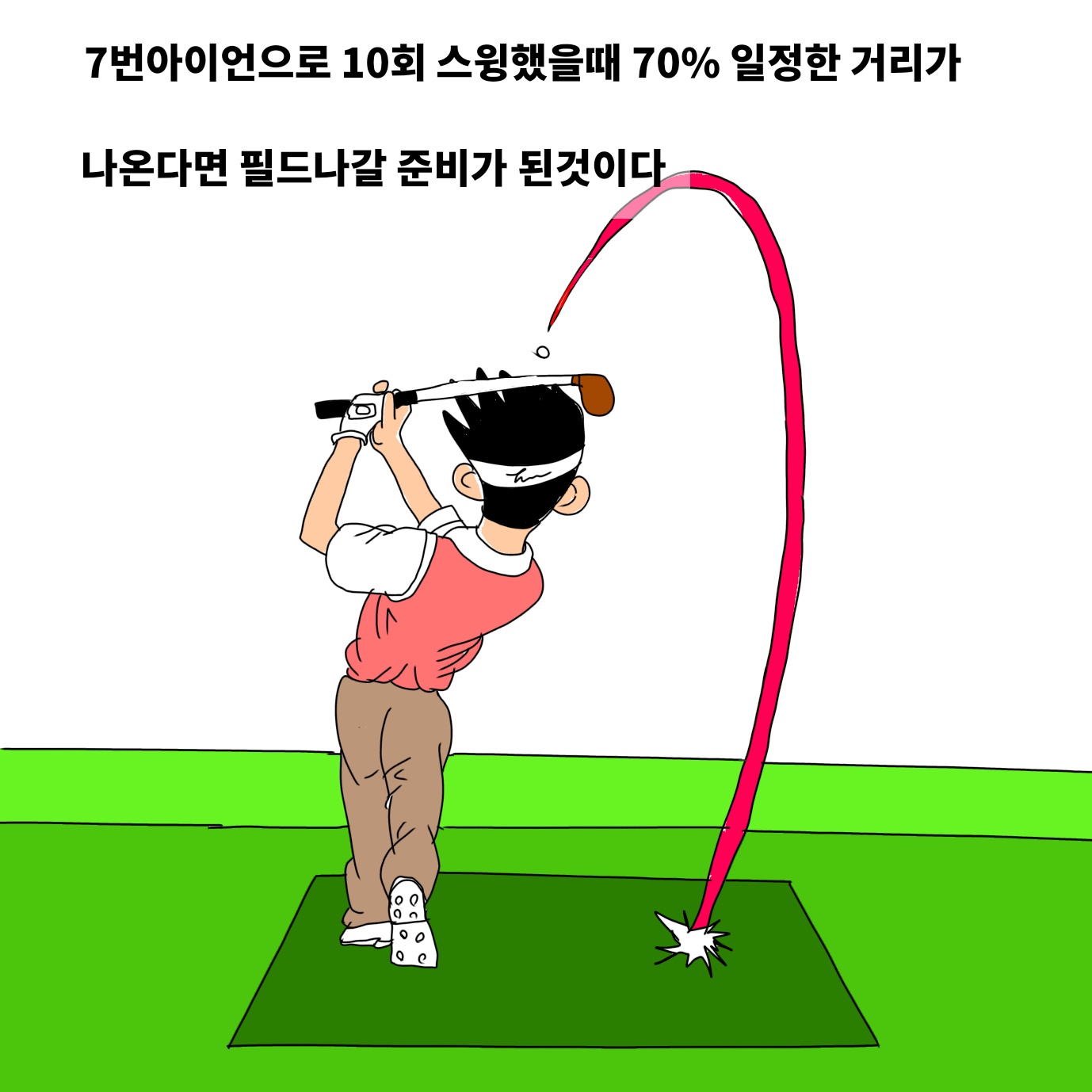 연습장에서 7번 아이언으로 50~100회 스윙을 해서 일정한 비거리가 70퍼센트 이상 나오면 필드에 나갈 수 있는 실력이다.