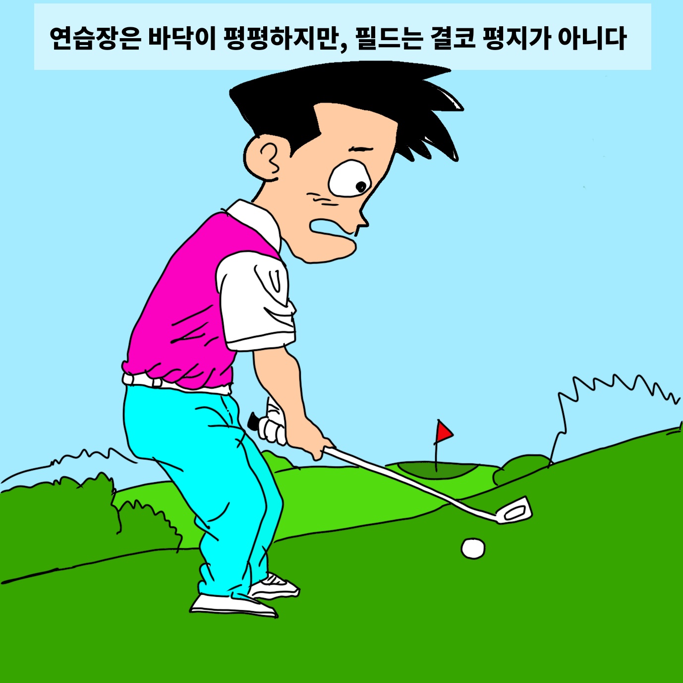 연습장은 바닥이 평지이지만, 코스에서는 볼의 라이가 내리막 오르막 · 업힐 라이. 다운힐 라이 · 디보트 · 벙커 · 러프 등 다양한 지형에서 스윙을 해야한다. 따라서 자신의 스윙을 제대로 갖추지 않은 채 코스에 나가면 다음과 같은 상황이 유발된다.