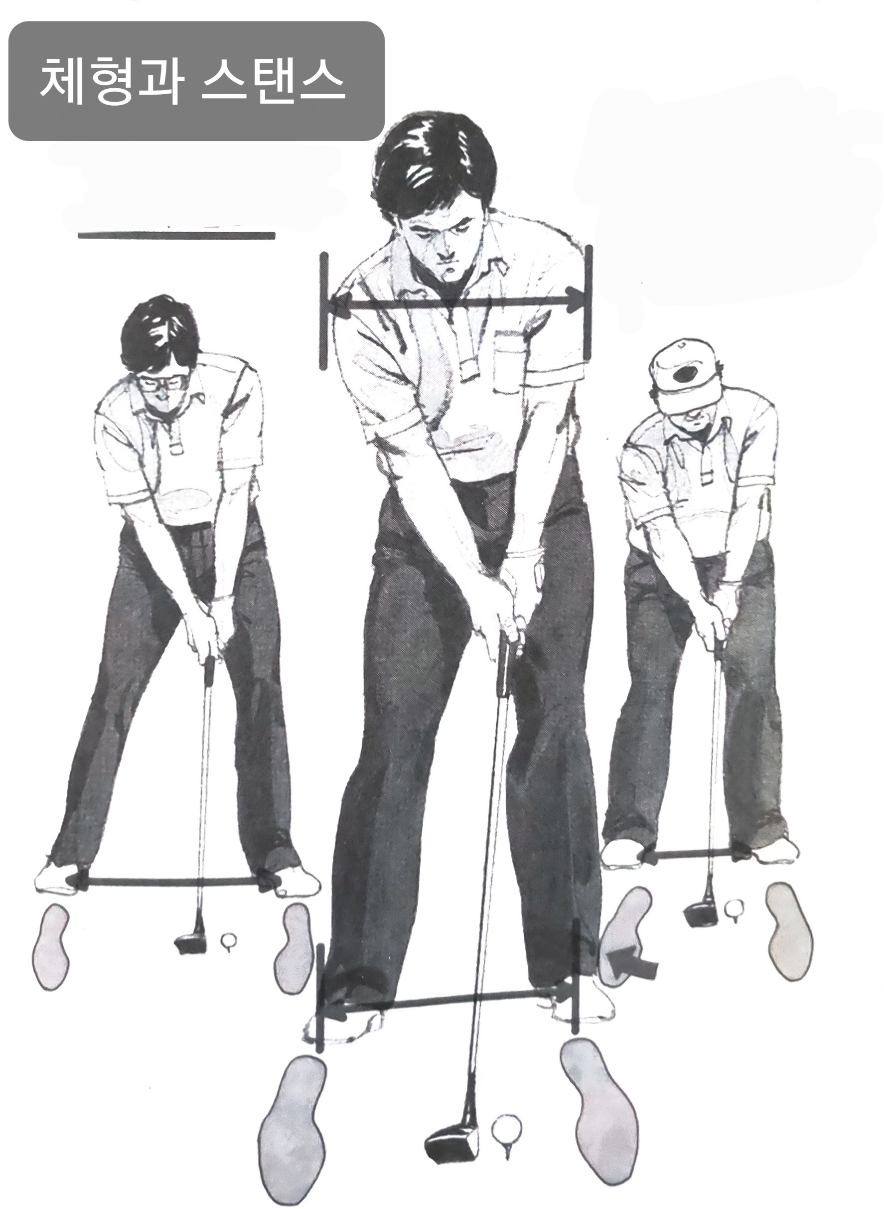 몸이 뚱뚱해서 몸의 회전이 어려운 사람은 스탠스(두발 사이)를 약간 좁게하여 오른 발끝을 약간열면 좋으며 이와는 반대로 몸이날씬한 사람이나 그리고 키가 큰사람은 스탠스를 넓게하여 하반신의 안정에 도움이 된다.