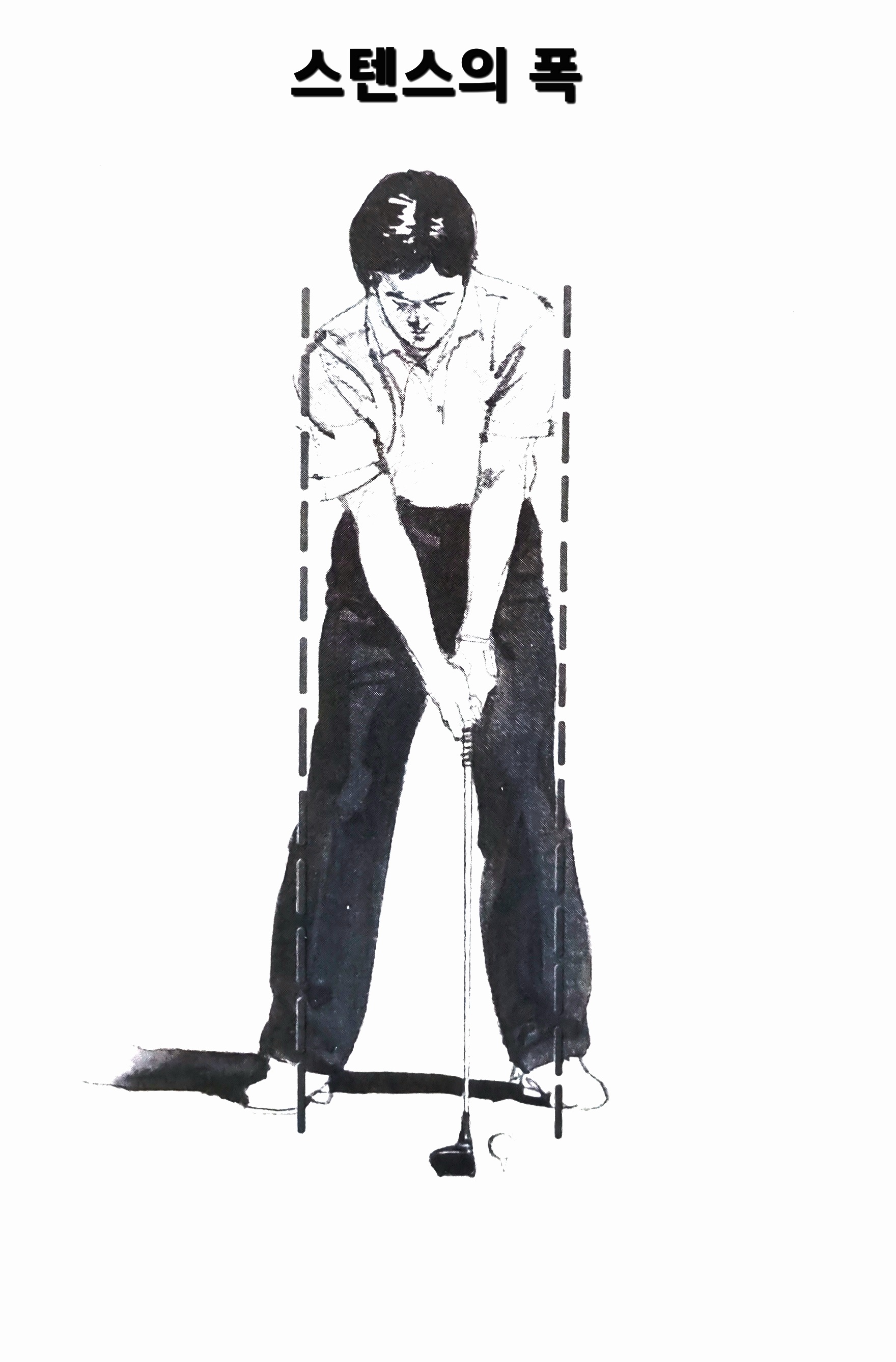 ● 드라이버의 경우 스탠스의 폭은 어깨 넓이가 기준이다. 지나치게 넓게하면 백스윙때 몸을 틀기가 어렵고이와 반대로 지나치게 좁으면 축이너무 돌아가는 경우가 많다.