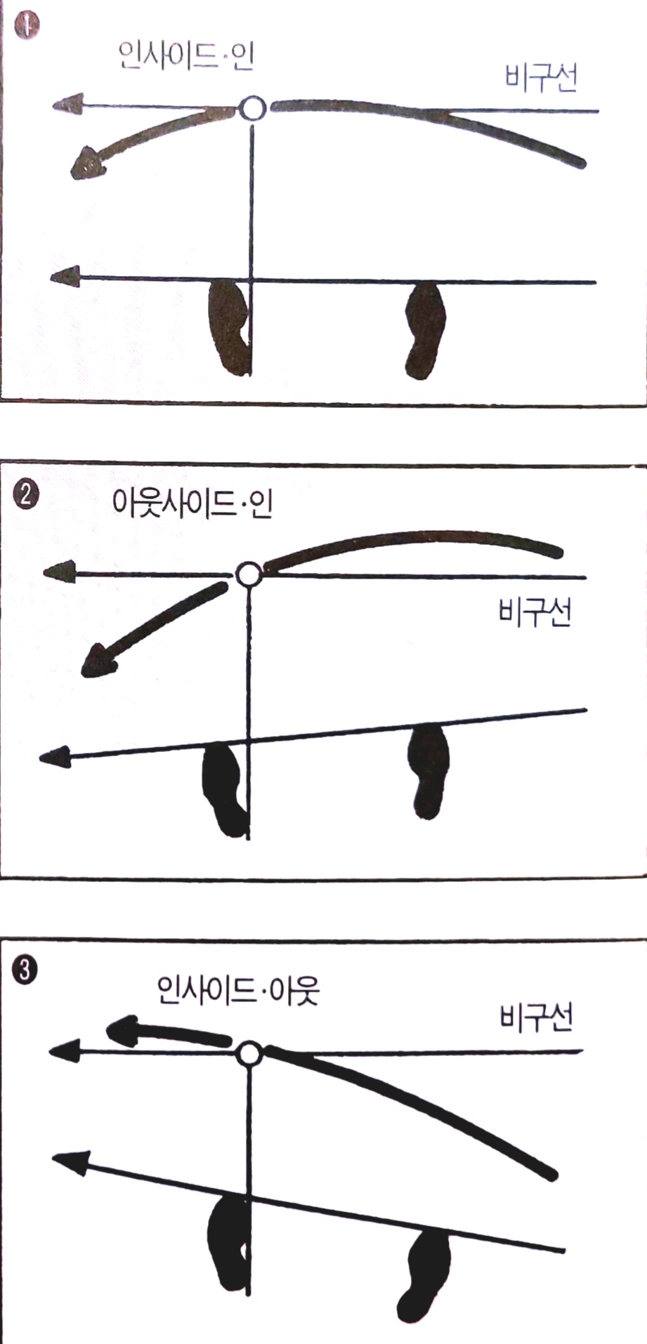 ● 이 스탠스의 폭으로 자세를취하면 볼을 사면위에서 내려다 보는 형태가 되므로 의식하지 않아도 어퍼·블로 우(클럽헤드가 스윙의 원형의최하 점을 지나 헤드가 위를향할때 볼을때리게 되는 타법)의 스윙궤도가 된다.