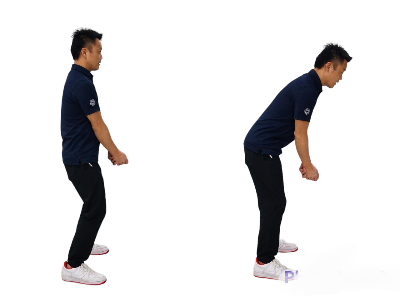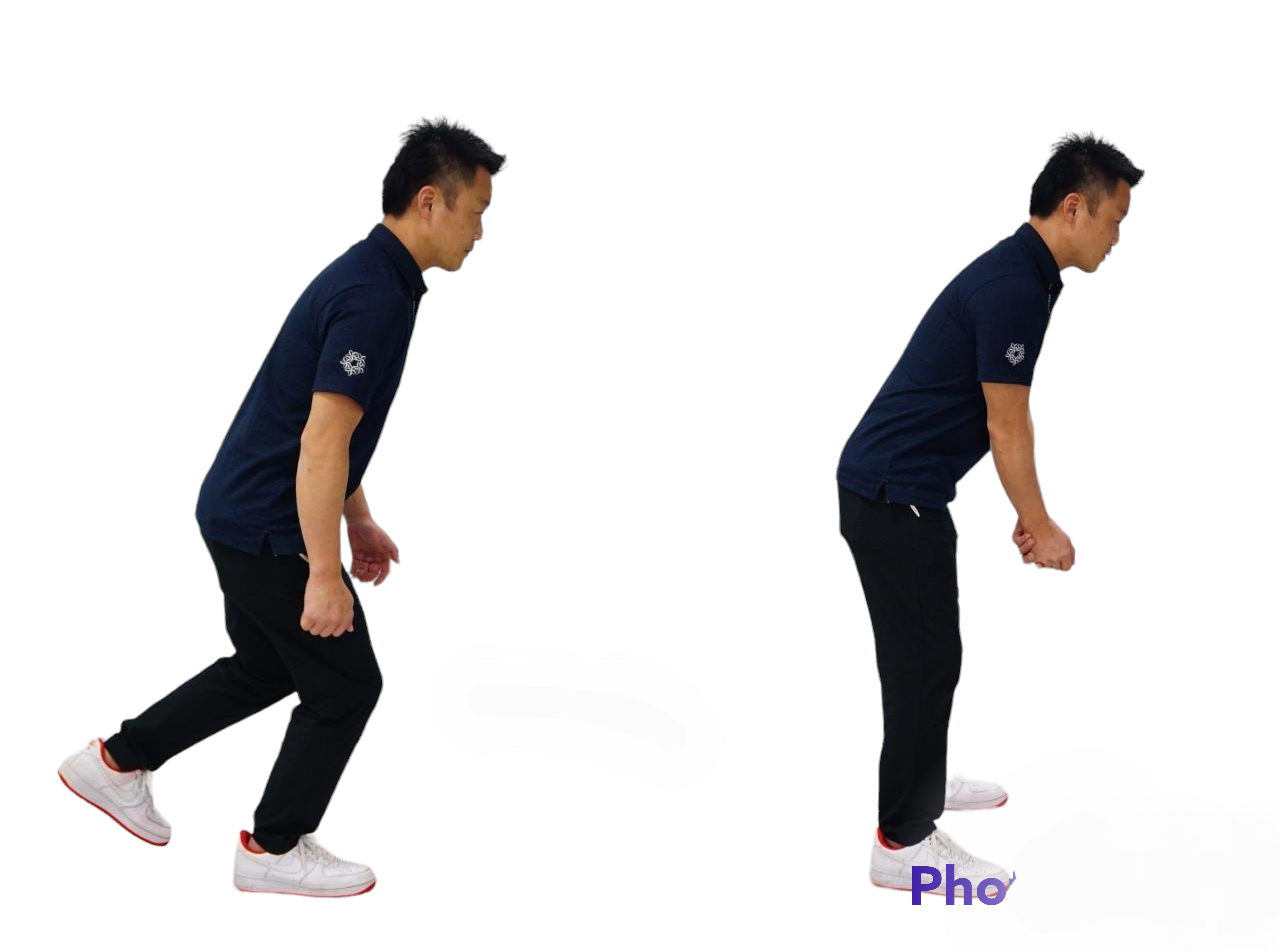 반대로 반대의 다리를 후방으로 움직여 밸런스를 취하려고 하는 타입은, 전경이 깊어지고 등도 둥글게 되기 쉽다.