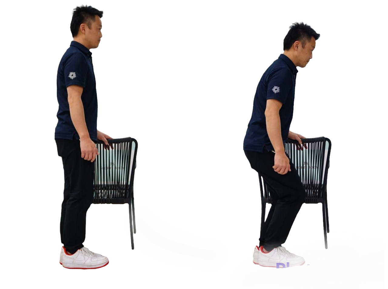 의자에 붙여 한쪽 다리로 스쿼트 하지만, 띄운 다리를 전후시키지 않고 상하를 1세트 10회. 일상적으로 무리하지 않은 범위에서 계속합시다.