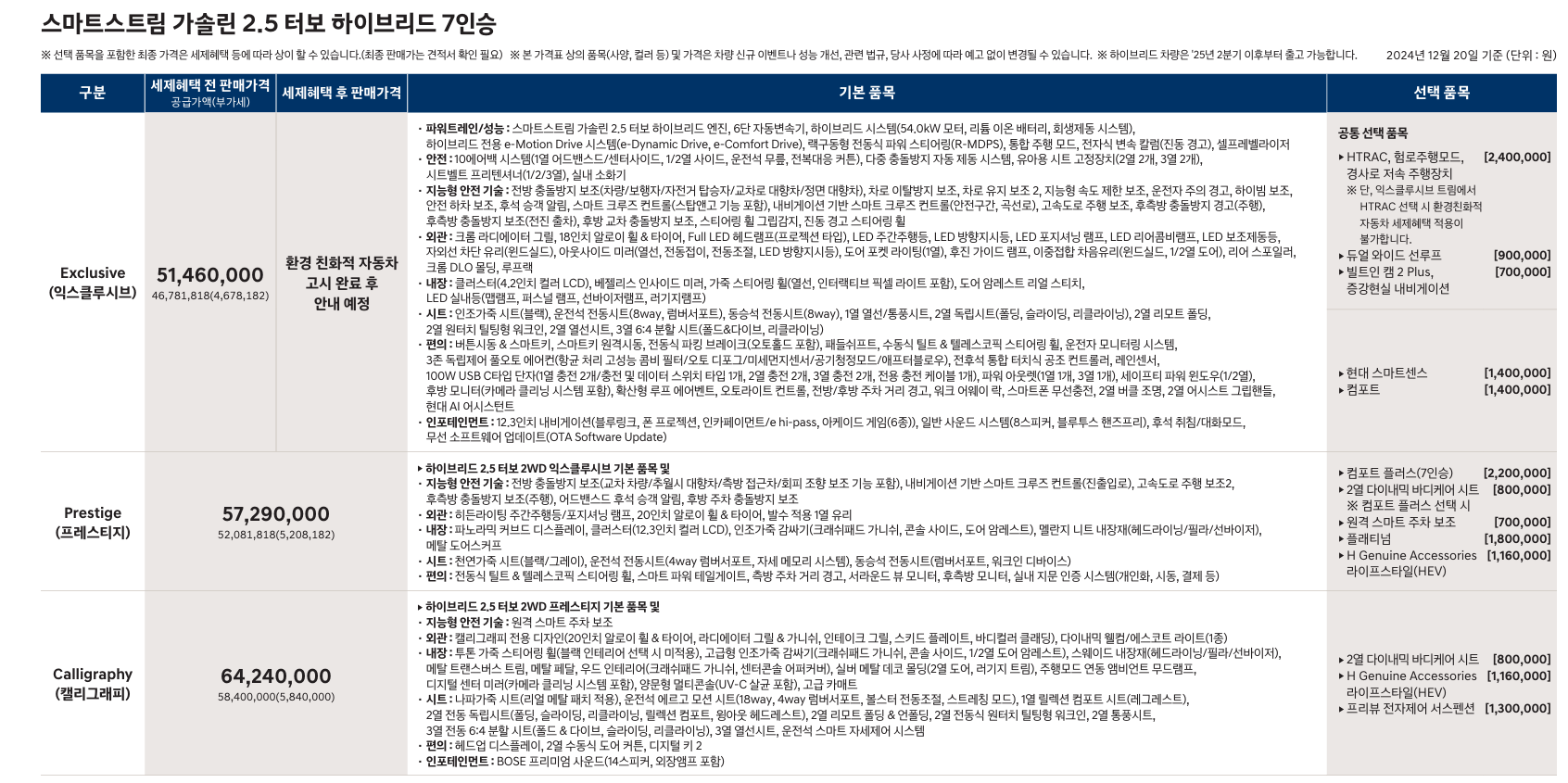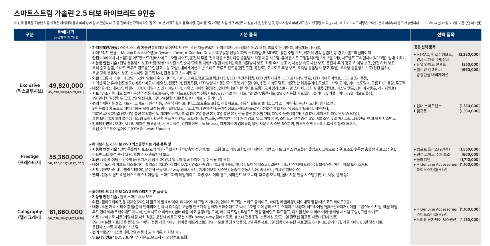 | 2.5 가솔린 터보 하이브리드 | 9인승 캘리그래피 | 61,860,000원 | 프리뷰 서스펜션, 고급 나파가죽, 20인치 알로이 휠 |