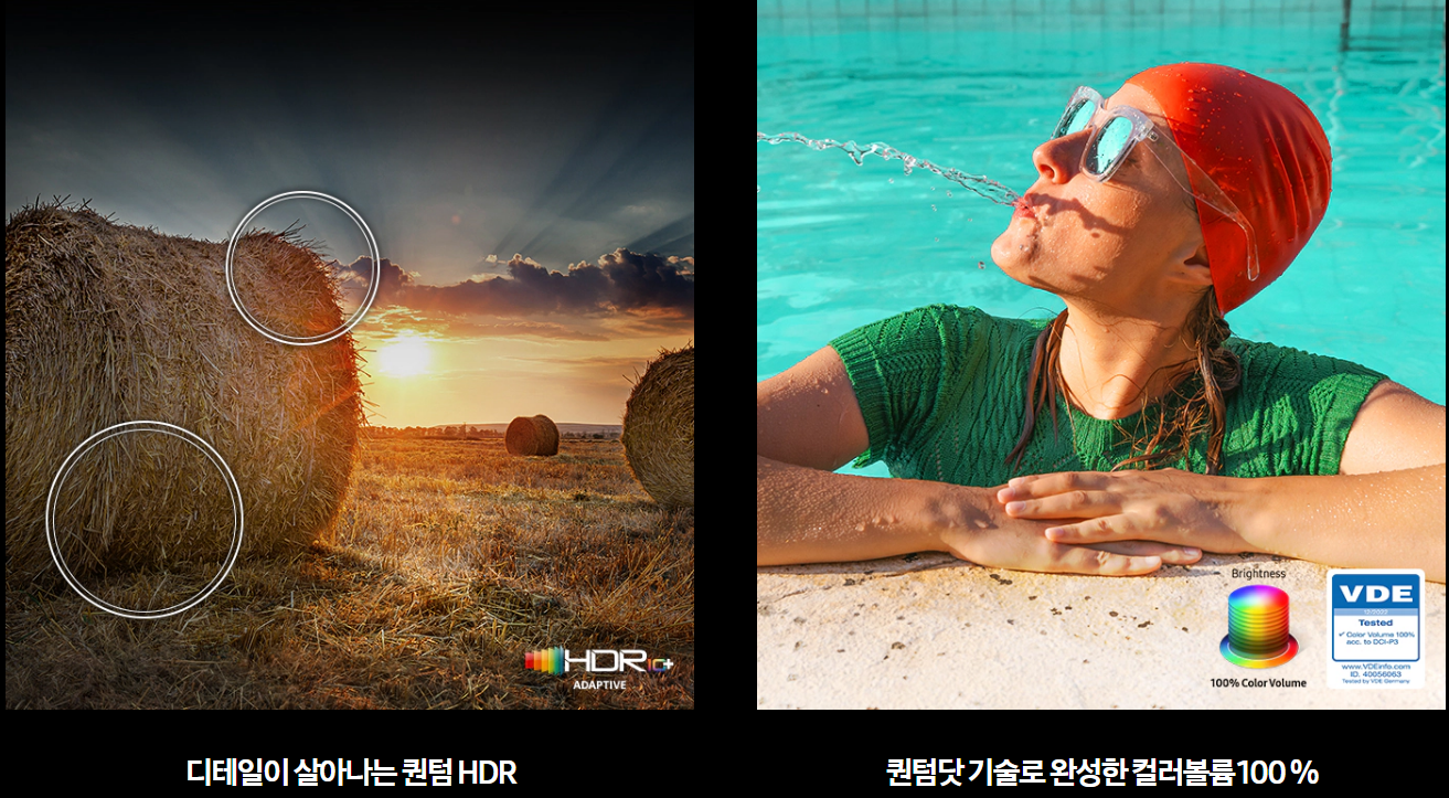 이 제품은 컬러볼륨 100%를 달성하는 퀀텀닷 기술을 사용하여 더욱 생생하고, 선명한 색상을 구현합니다.