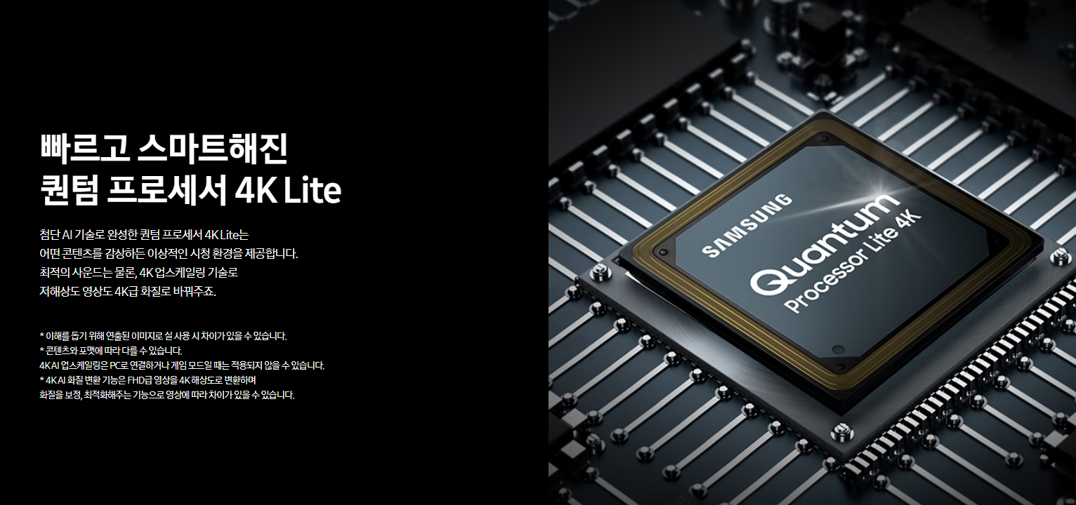 이 제품은 퀀텀 프로세서 4K Lite를 탑재하여 4K 해상도의 영상을 매끄럽게 처리합니다. 또한, 4K AI 업스케일링 기술을 통해 저해상도의 영상도 고해상도로 변환하여 선명한 화질을 즐길 수 있습니다.