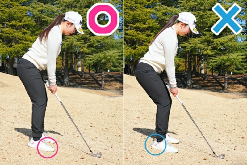 무게 중심을 떨어뜨려 손이 핸드 다운이 되면, 스윙 궤도가 업라이트가 되어, 걸림의 실수가 나기 쉬워집니다. 목표보다 약간 왼쪽으로 목표를 잡고 경사를 따라 발바닥. 처음부터 슬라이스 볼을 노리고 치는 의식이 중요합니다.