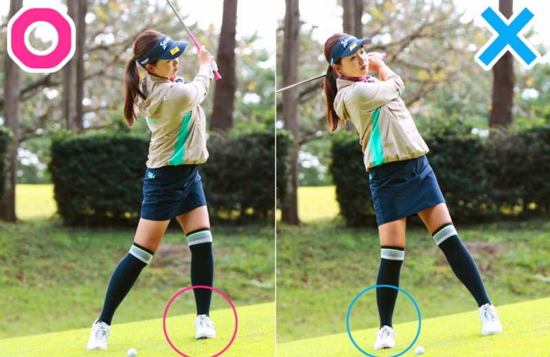 왼발 오르기에서는, 임팩트로 로프트각이 눕혀지기 쉬워 비거리가 나오기 어렵기 때문에, 한클럽 크게 잡습니다(9번->8번). 스윙은 오른쪽 다리에 체중이 남아 있으면 페이스가 너무 돌려 훅이 나오기 쉽기 때문에 오른쪽 다리에 체중이 실리지 않도록 경사에 약간 거꾸로 왼발에 실어 스윙합니다.