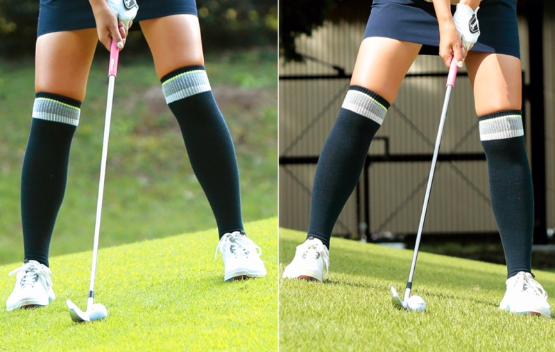 훅이 나오기 쉬운 왼발 오르막 라이와 임팩하기 어려운 왼발 내리막 라이.