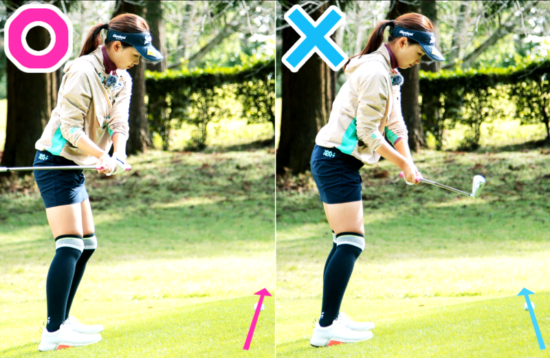 발끝 오르막 라이에서 샷은 볼이 왼쪽으로 나오기 쉬운 경향이 있습니다. 지나치게 대비하여 페이스는 조금 열리고, 궤도 이미지는 인사이드 아웃. 아웃사이드 인의 궤도로 스윙 하면, 헤드가 볼의 뒤에서 착지하는 뒤땅이 쉽기 때문입니다 .