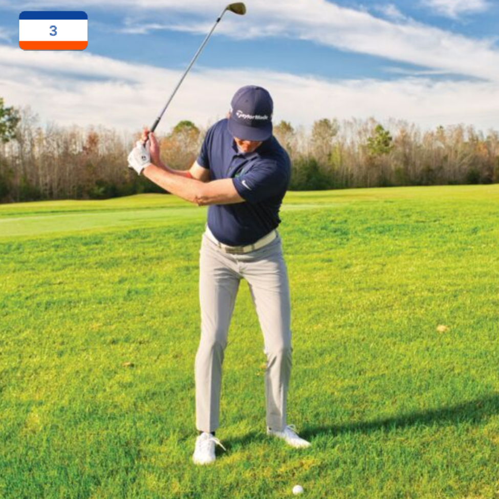 높은 탄도를 위해 백스윙을 많이 하세요. 백스윙에 더 많은 에너지를 저장할수록 다운스윙에서 더 많은 에너지를 방출할 수 있습니다(사진 3).