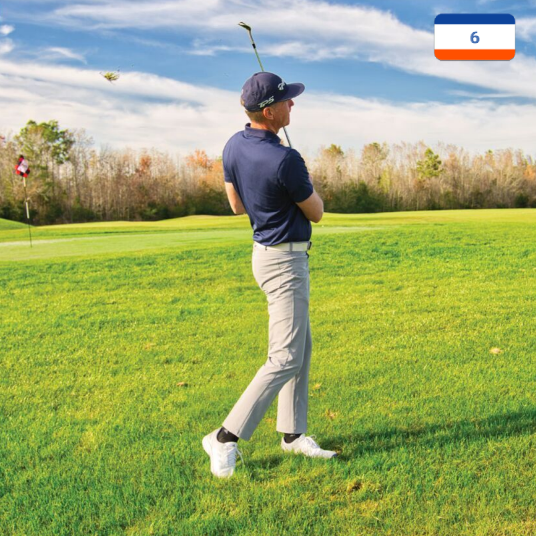 피니시에서, 몸을 바짝 붙이고 타겟을 마주하고 있고, 허공에 내 뒤에 있는 잔디가 눈에 띈다. 내 디봇은 풀 스윙처럼 앞으로 나아가지 않고, 내 왼쪽 어깨 너머로 내 뒤로 가고 있다. 아이스크림을 떠먹는 대신에, 나는 잔디를 듬뿍 뜨고 있다. (사진 6).
