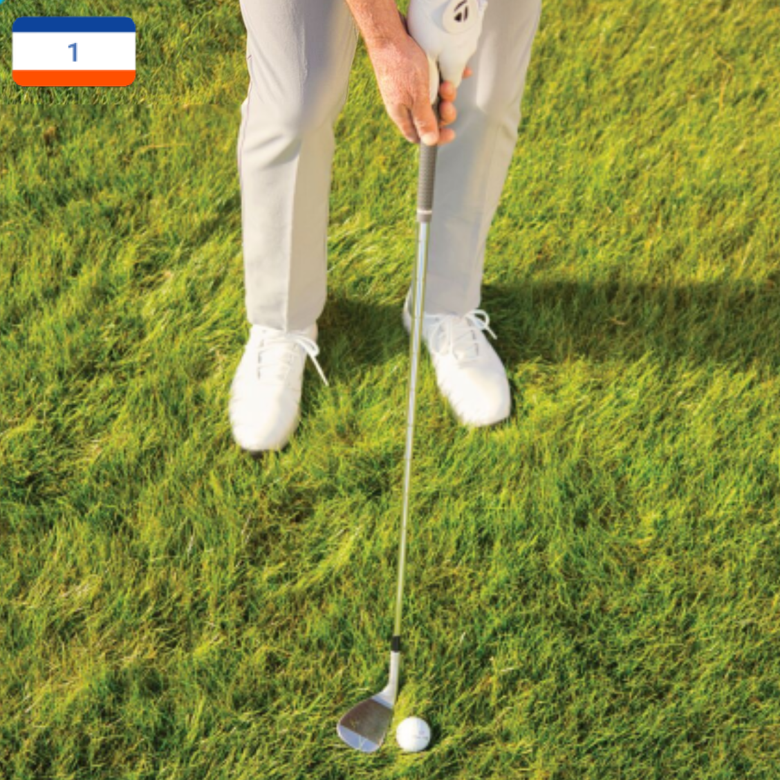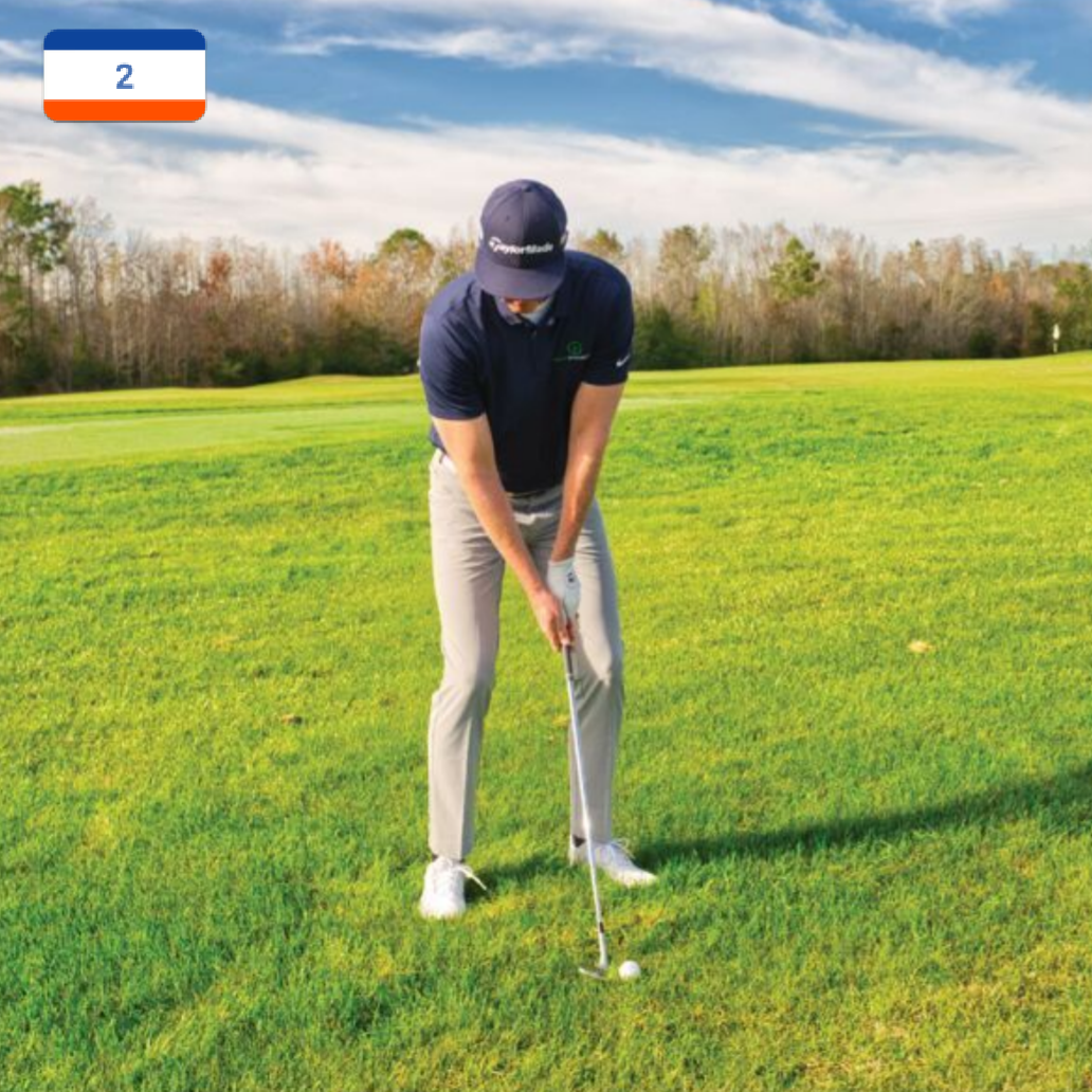 더 높은 피치 샷을 칠 때는 스탠스를 넓히고 무릎을 구부린다. 체중을 50/50으로 유지하세요