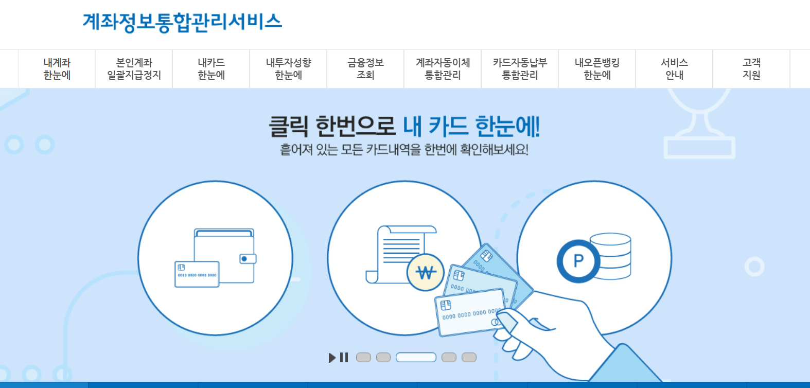'어카운트인포'는 본인 명의로 개설된 계좌를 한눈에 파악하고 관리할 수 있게 도와주는 서비스입니다. 신용카드 포인트, 자동이체 내역 등 복잡한 금융 정보를 쉽게 확인할 수 있으며, 필요 없는 상품 해지도 가능합니다.