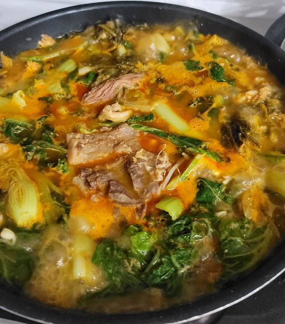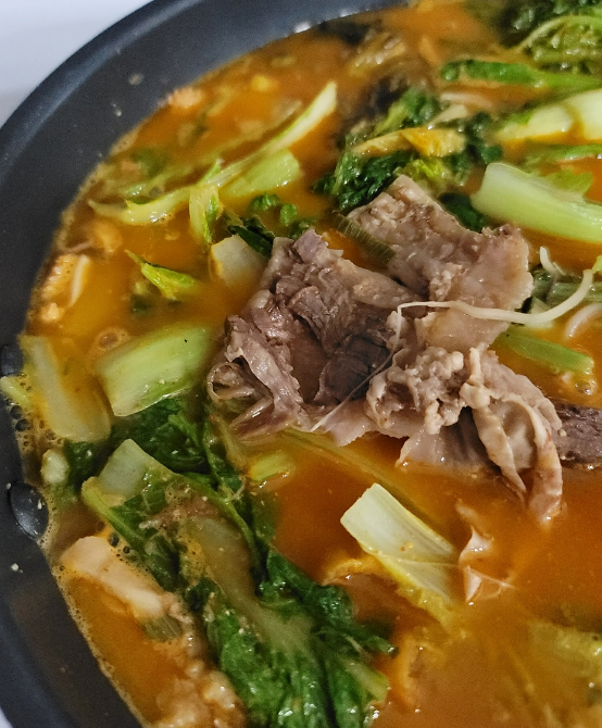 보글보글 완성되어가는데 이때의 맛있는 냄새가 퍼지면서 배꼽이 시계도 울리기 시작했어요. 국물이 얼마나 들어갔는지 국자로 떠올려보니, 국물이 많고 건더기는 많지 않지만 충분해서 먹기 전부터 기분이 좋았습니다. 냄새도 완전 최고였어요.