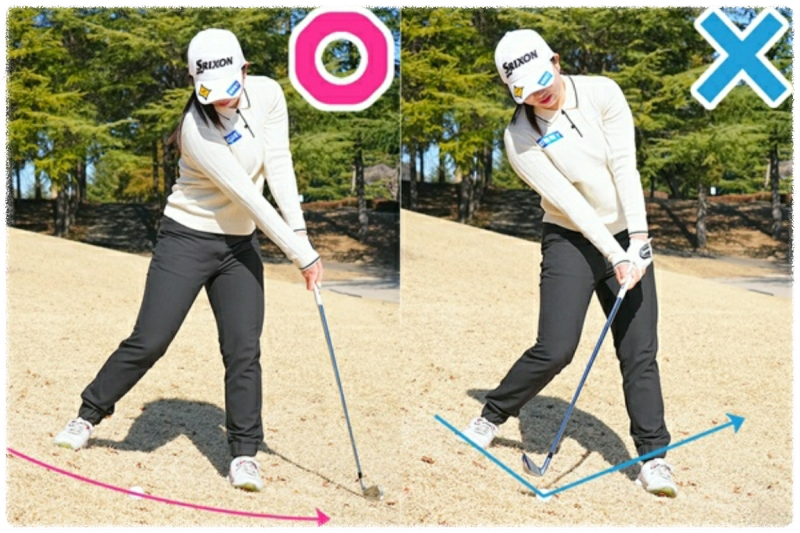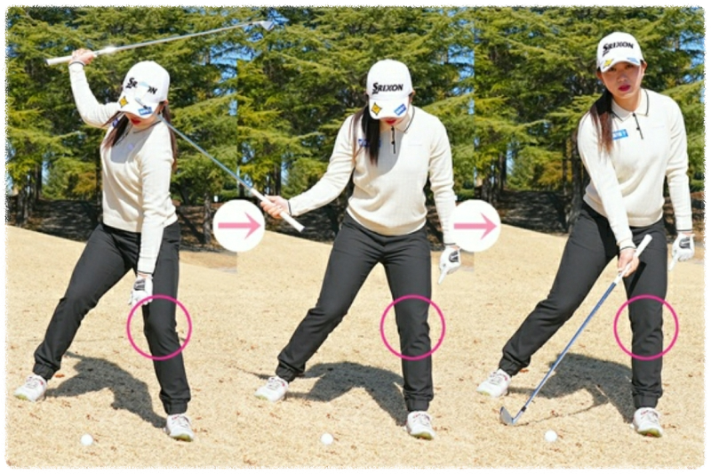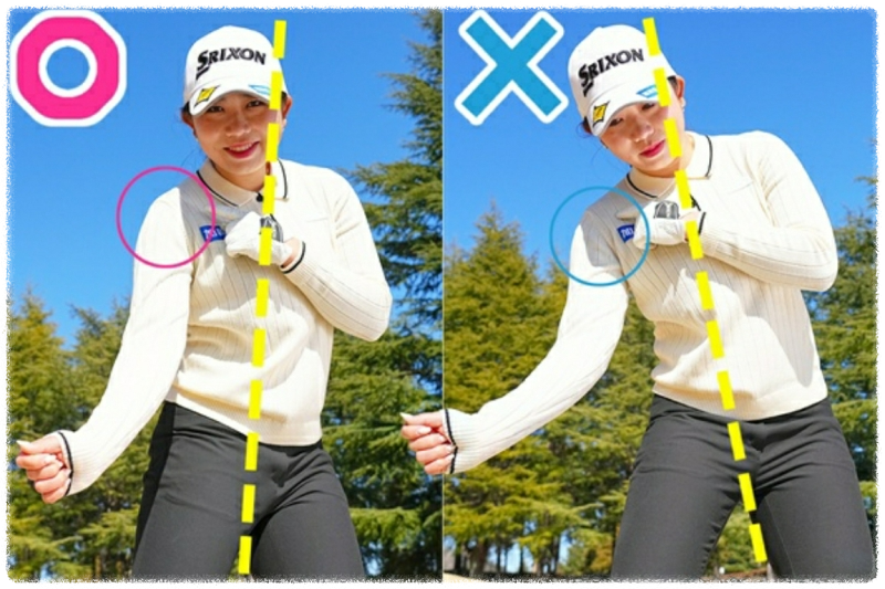 왼발 아래쪽은 기울어져 있고 몸의 축을 유지하는 것이 중요합니다. 양 어깨·양허리의 라인을 항상 경사와 평행하게 유지하는 것 . 축이 오른쪽으로 기울어지지 않았는지 확인할 수 있는 곳은 오른쪽 어깨입니다. 오른쪽 어깨가 내려가지 않고 상체가 돌고 있으면 축이 흔들리지 않는 증거입니다.