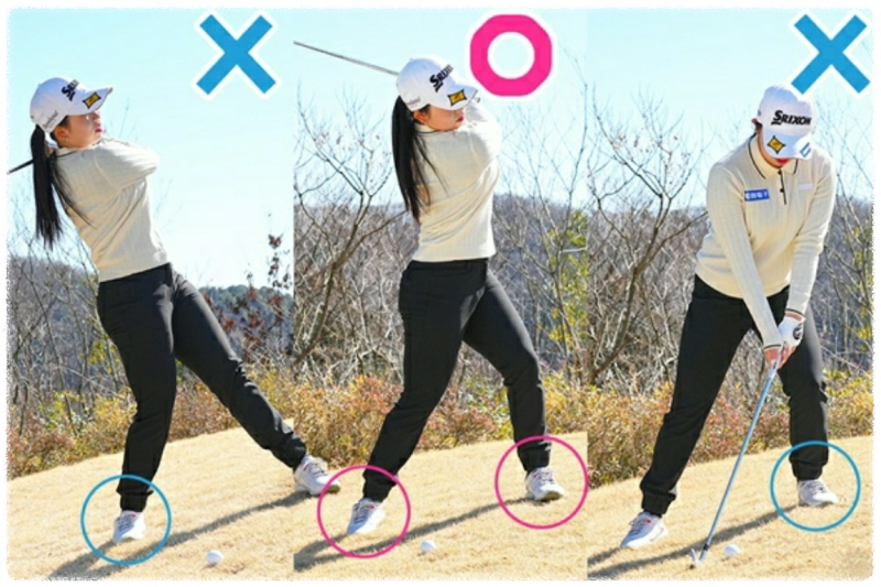 왼발 오름막 상황은 왼발에 체중을 올려 버리면 팔로우 헤드가 빠지기 어렵고, 반대로 오른쪽 다리에 체중을 올리면 로프트가 누워 버려 거리감이 맞추기 어렵습니다. 왼쪽도 아니고 오른쪽도 아닌 경사에 따른 체중 배분을 유의하고 어드레스를 취합시다.