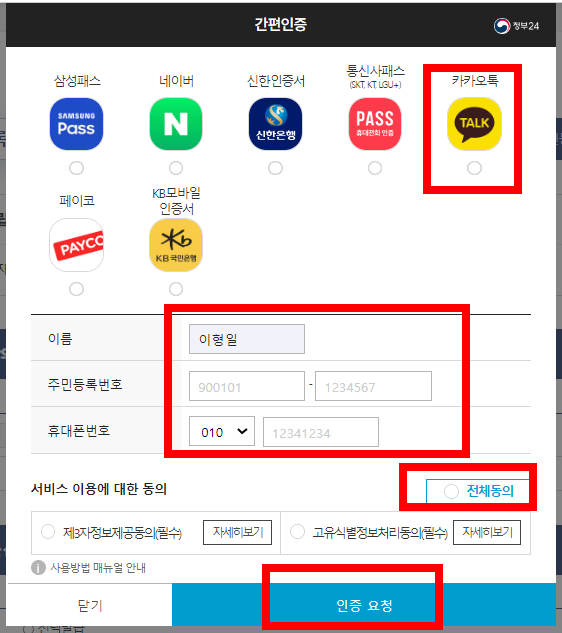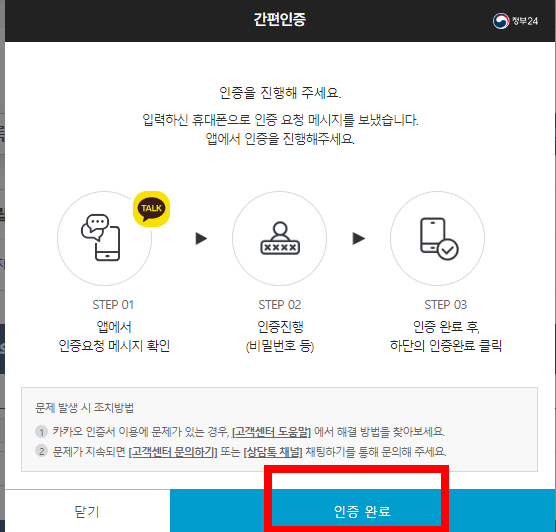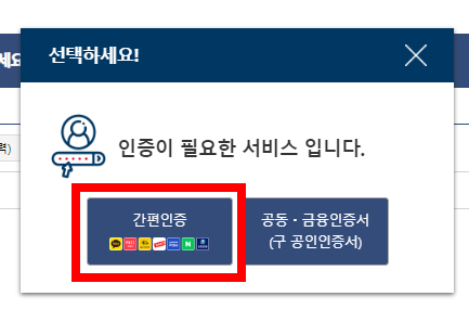 발급을 신청할 때는 인증을 해야하는데요. 간편인증을 통해서 네이버나 카카오 등과 같은 것을 이용해서 진행하셔도 되고 공동·금융인증서를 사용해서 하셔도 됩니다. 여러분들이 편한 방법을 사용하세요.