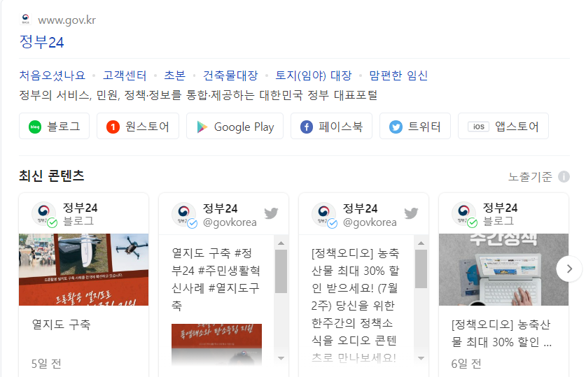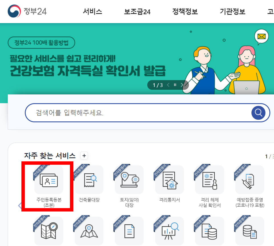 정부24로 들어오면 다음과 같은 페이지를 볼 수 있는데요. 여기에서 상단이나 좌우측 모두 메뉴가 있는데 우리는 자주 찾는 서비스라는 부분에 있는 주민등록등본(초본) 메뉴를 누르면 됩니다.