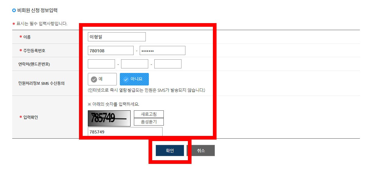 그리고 아래에는 신청 정보입력 부분이 있으니 붉은색 * 표시가 되어있는 부분의 내용을 기입한 뒤 확인을 눌러 넘어갑니다.