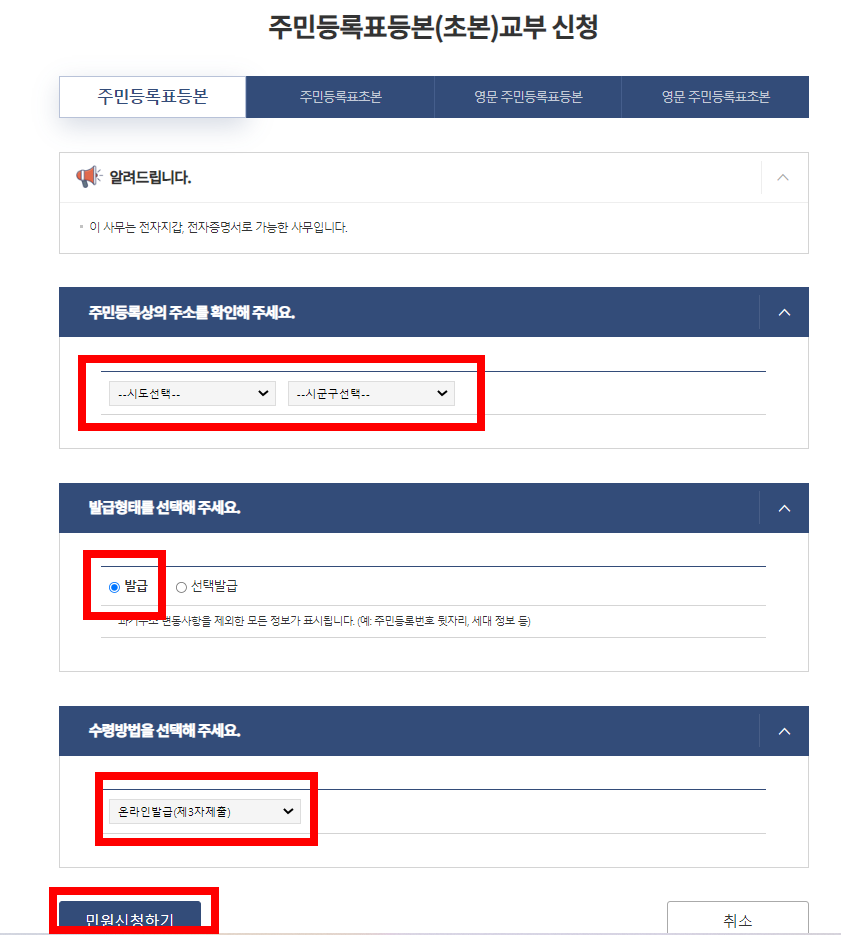 위쪽을 보시면 등본 외에도 초본, 영문으로 발급하는 메뉴 등이 있습니다. 따라서 필요한 것을 선택하시고 주민등록상의 주소를 확인한 뒤 발급형태를 선택하면 됩니다.