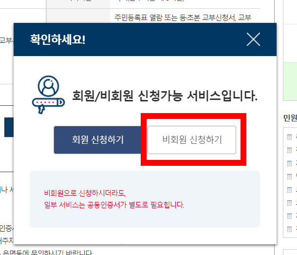 버튼을 누르면 회원/비회원 신청 가능 서비스라는 안내와 함께 두가지 중 하나를 선택할 수 있는데요. 아이디가 있고 기억하고 있어서 쉽게 로그인이 가능하다면 회원으로 하시면 되지만 그렇지 않다면 비회원으로도 어렵지 않게 발급 받을 수 있습니다.