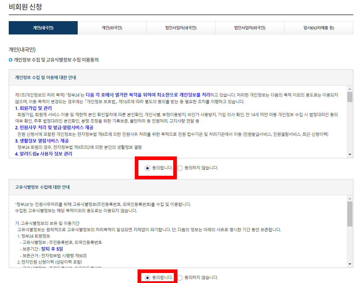 아마 계정이 없거나 까먹으신 분들이 많을 것 같아 비회원 기준으로 알아보도록 하겠습니다. 이런식으로 개인과 사업자, 내국인, 외국인 등과 같은 기준이 있으니 자신에게 맞게 진행해주세요.
