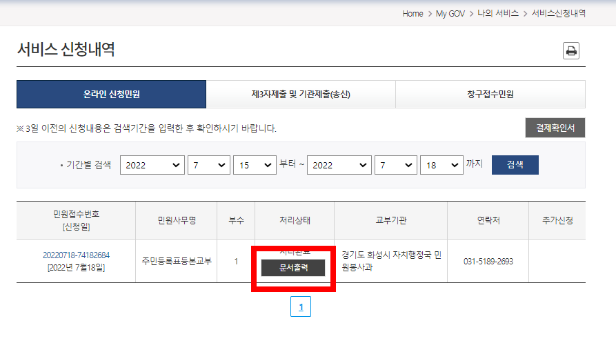 인증까지마치고 신청을 하면 이렇게 내역 부분으로 넘어오는데 여기에서 처리상태에 있는 문서출력 버튼을 클릭하시면 됩니다.