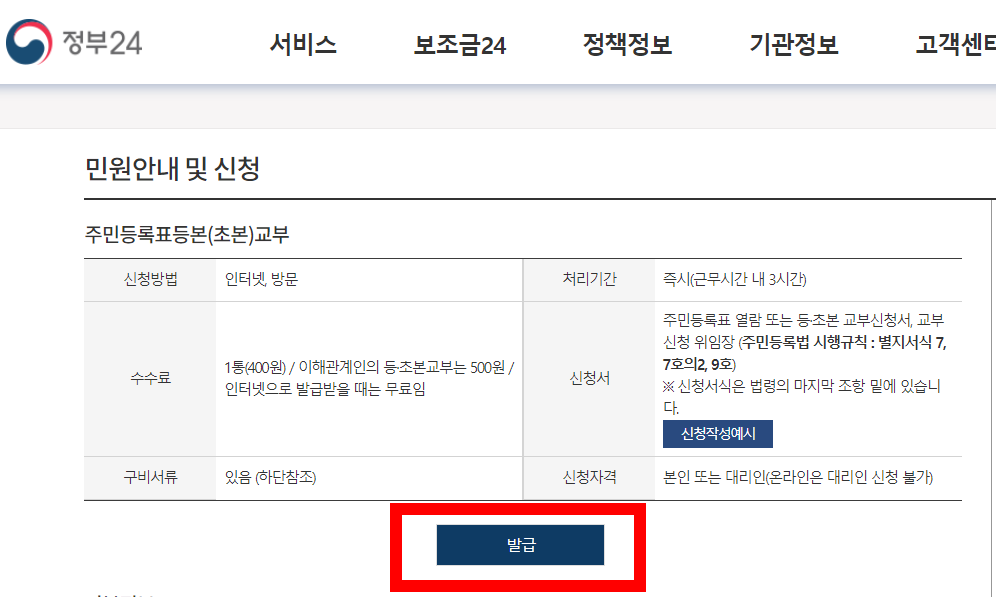 들어와보면 이렇게 민원안내 및 신청 방법에 대해서 적혀있는데요. 수수료같은 경우에는 인터넷으로 발급받을 때는 무료입니다. 기타 내용도 읽어보시고 발급 버튼을 눌러주세요.