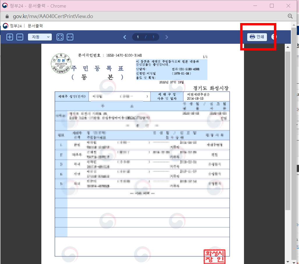 우리가 확인하고자했던 주민등록등본이 창으로 열리면 우측 상단에 위치한 인쇄버튼을 클릭합니다.