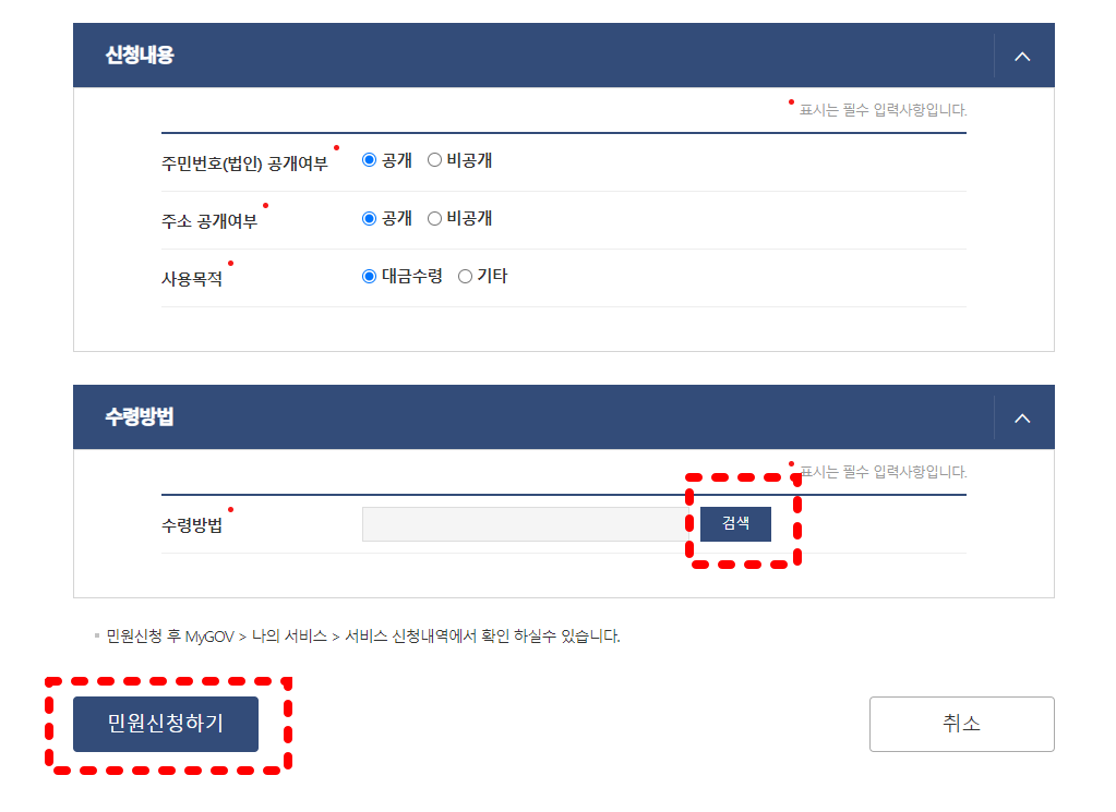 현장에서 요구하는 대로 신청 페이지를 클릭해 작성하면 사업자 분류, 주민등록번호 표시, 주소, 전화번호 등을 입력해야 한다. 여기서 사업자 분류는 개인인지 법인지 판단하기 위한 것으로 주민등록번호가 전체인지 일부인지를 선택할 수 있지만, 자세히 살펴보고 발급사유에 따라 표시해 주시기 바랍니다. 참고로 빨간색으로 표시된 것은 필수 확인 사항이니 작성해주세요. 수령방법 선택후 민원신청하기 클릭
