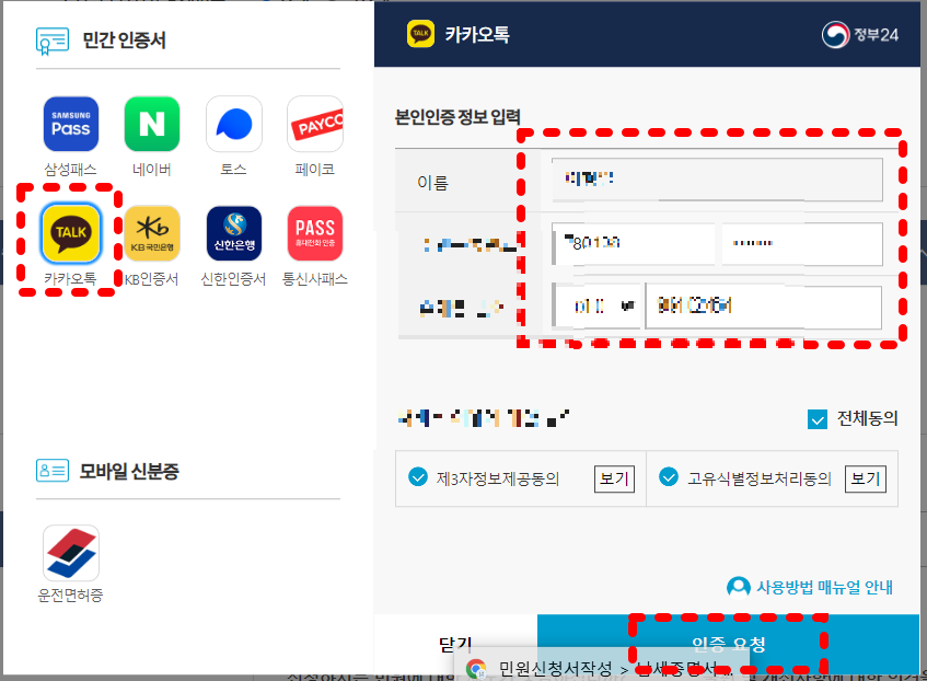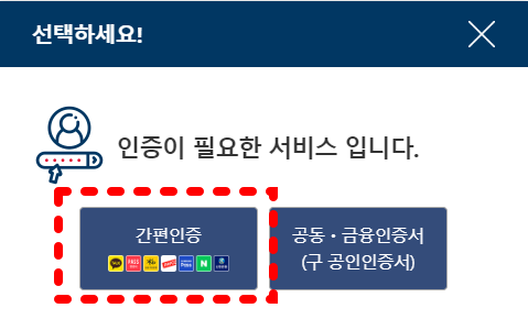 개인 인증은 간편 인증이나 공인인증서로 로그인할 수 있습니다. 저는 카카오로 인증합니다