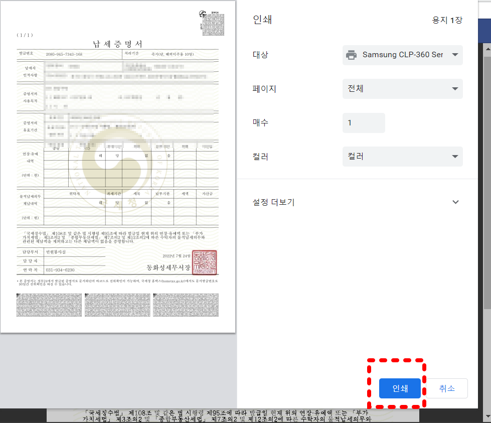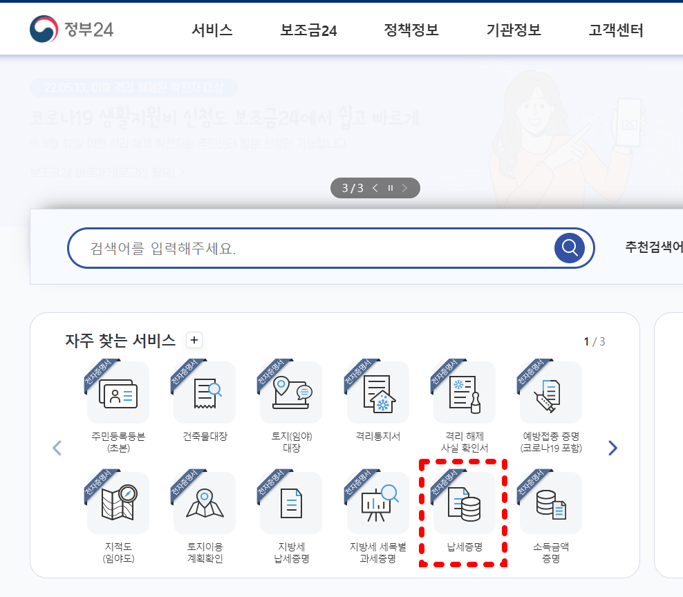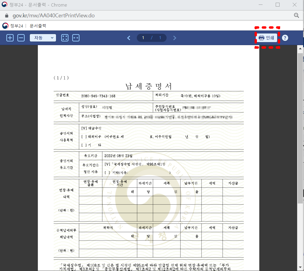 오른쪽 하단에 납세증명이라는 아이콘을 클릭