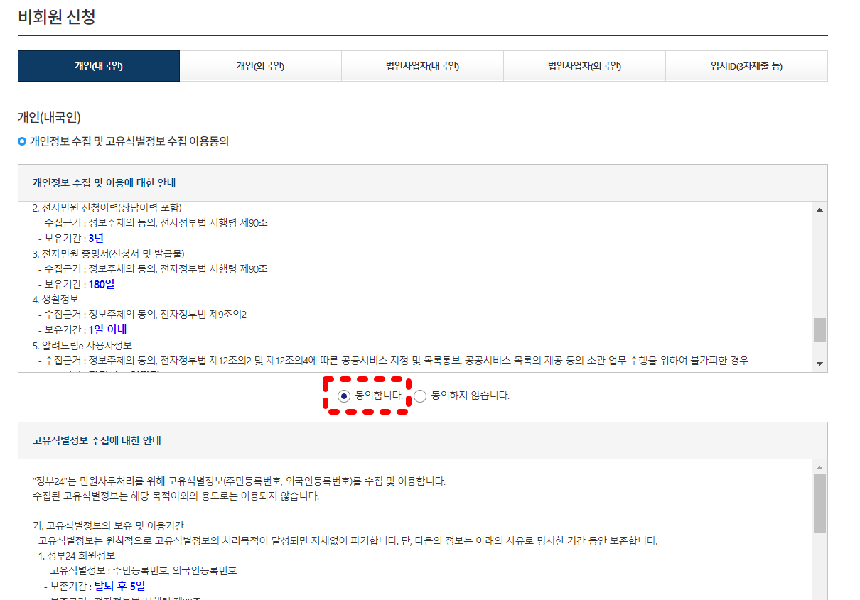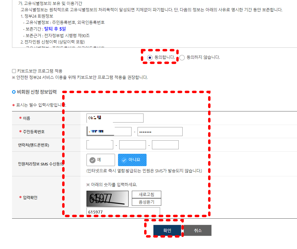 발급을 클릭 후 전부 동의를 표시 기본정보를 입력합니다.