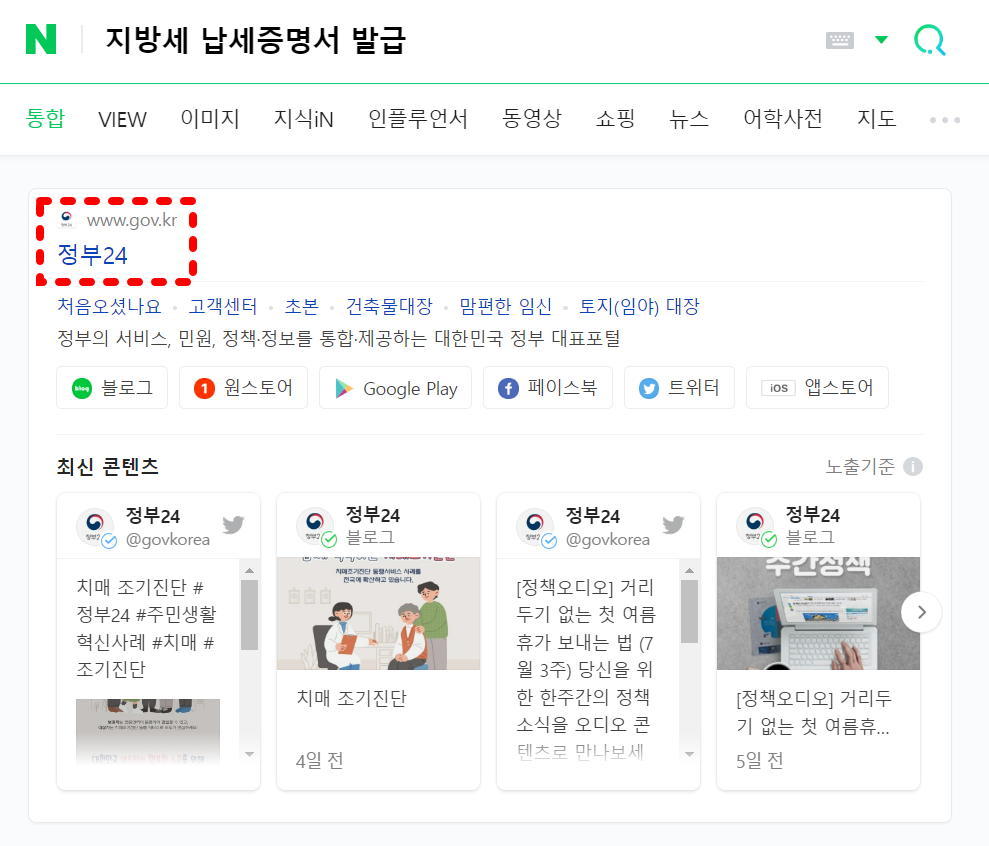 검색창에 지방세 납부만 쳐도 자동으로 정부 24 사이트가 등장한다. 정부24 클릭후
