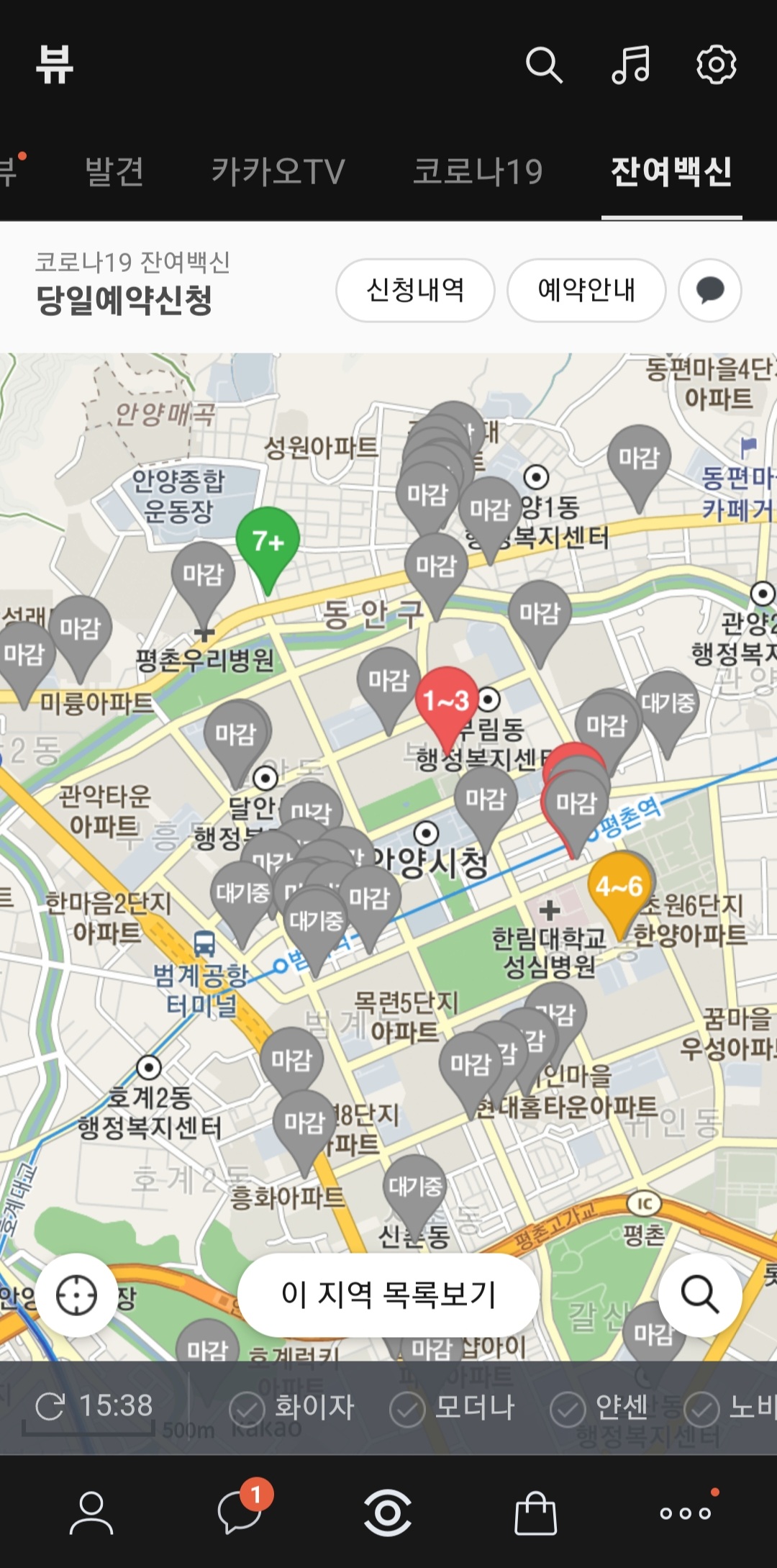 2. 카카오톡 뷰, 맨 위에서 잔여백신 선택