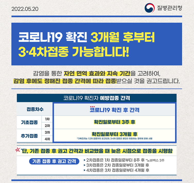 질병관리청 홈페이지에 따르면 완치자 또는 확진자라도 시간이 경과하면 면역력이 약화되므로 3차까지 필수 및 4차 접종 (대상자만)을 권고하고 있습니다.