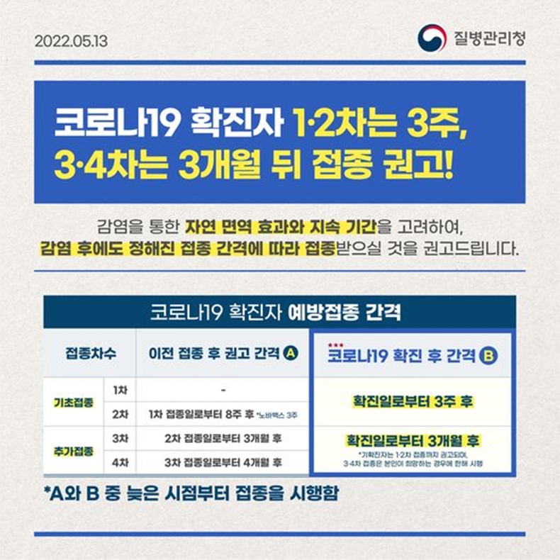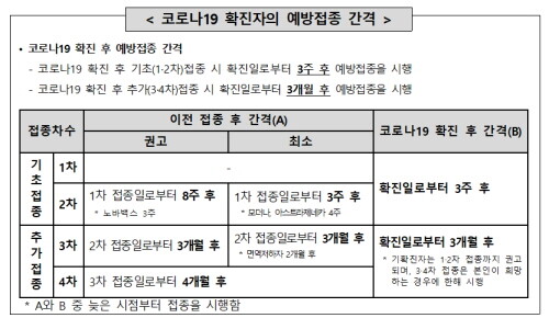 정부가 2022년 5월 13일 발표한 자료에 따르면 4차 예방접종의 경우 확진일로부터 3개월 후 예방접종을 하는 것이 좋다. 그러나 이것은 필수가 아니라 권장 사항임을 명심하십시오. 일부 지자체는 확진 후 3개월이 지나지 않았더라도 4차 접종을 실시하고 있어 3개월이 되지 않았더라도 4차 접종을 원할 경우 해당 지역 보건소나 의료기관에 직접 문의해보는 것도 좋을 것으로 보인다.