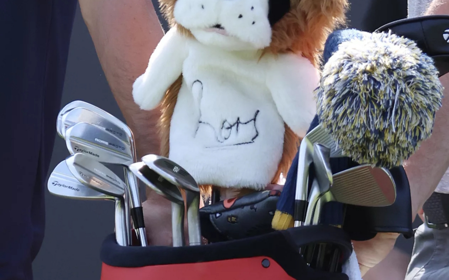 그의 가방을 클로즈업하면 스태프 가방에 평소 TaylorMade Rors Proto 아이언과 함께 두 개의 Vokey가 들어 있습니다.