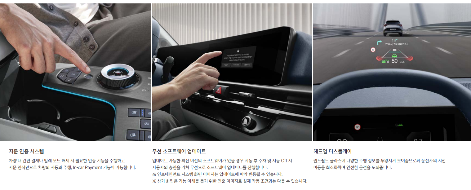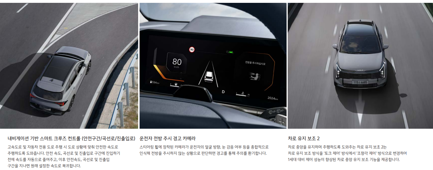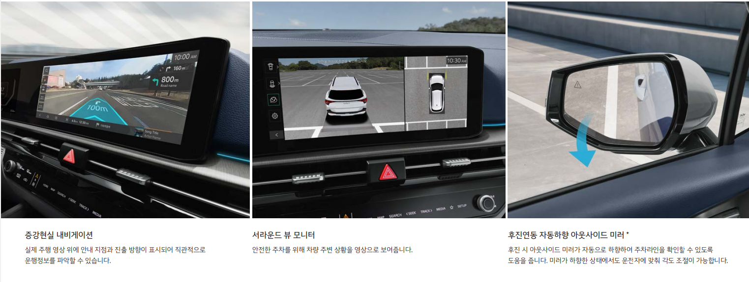 운전석에는 적외선 타입의 운전자 전방 주시 경고 카메라가 탑재되어, 전방 주시 태만을 감지하고 적시에 경고를 제공합니다. 12.3인치 중앙 디스플레이는 최신 ccNC(커넥티드 카 내비게이션 콕피트) 시스템을 지원하며, 다양한 메뉴와 타일 형식 UI로 사용자 경험을 개선했습니다. 또한, e-하이패스와 빌트인 캠 2가 기본으로 제공되어 추가적인 차량 용품 구매의 필요성을 줄였습니다.